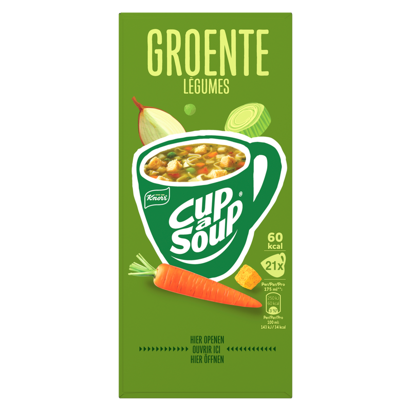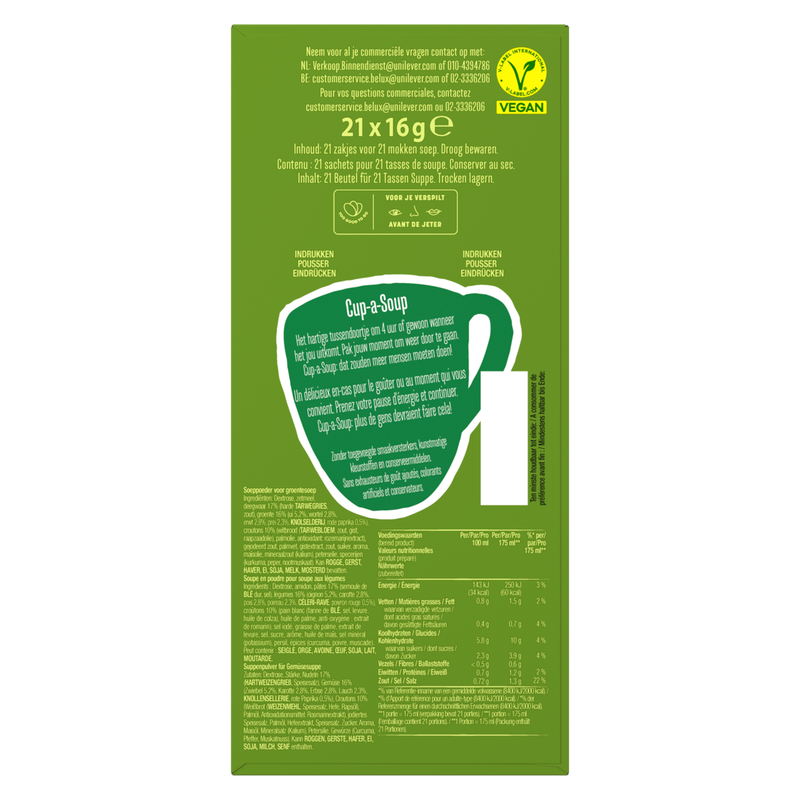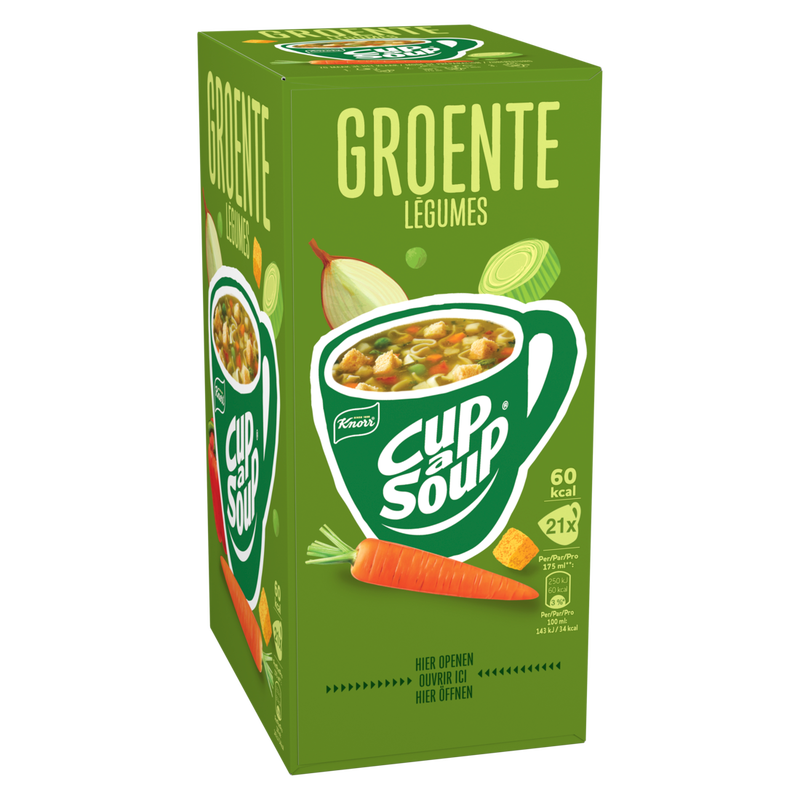 Heb je zin in een lekker soepje? Of heb je een drukke dag en zin in een snack om weer scherp en alert door te kunnen? Dan zit je bij Cup-a-Soup altijd goed! Zo ook met Cup-a-Soup Groente: een snelle, hartige opkikker die je weer energie geeft om door te gaan! Een goed gevulde groentesoep met smaakvolle rode paprika, ui, wortel, erwt, knolselderij, prei en knapperige croutons. In een verpakking Cup-a-Soup Groente zitten 21 heerlijke zakjes Cup-a-Soup. Een zakje van deze heerlijke Cup-a-Soup Groente bevat 60 calorieën per mok. Deze Cup-a-Soup Groente bevat geen kunstmatige kleurstoffen, conserveermiddelen of toegevoegde smaakversterkers en is ook geschikt voor vegetariërs en veganisten.